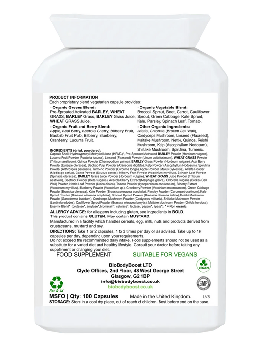 SuperBio Capsules - Organic Food Form Greens An organic foods blend of grains, greens, fruits, berries, seeds, vegetables, mushrooms, herbs and bio-active enzymes in easy to take capsules: Quickly and easily access 35 organic fruits, vegetables, grains, greens, berries, seeds and herbals on a daily basis with just this one...